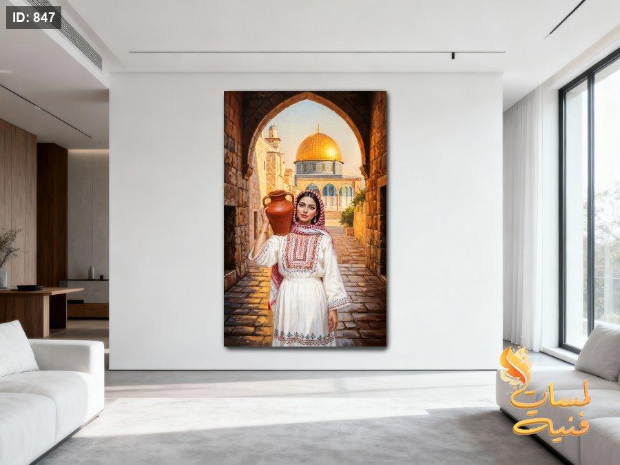 لوحة فلاحة تحمل جرة امام قبة الصخرة