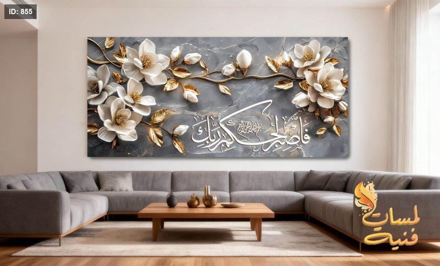 لوحة ورد ابيض وذهبي واصبر لحكم ربك