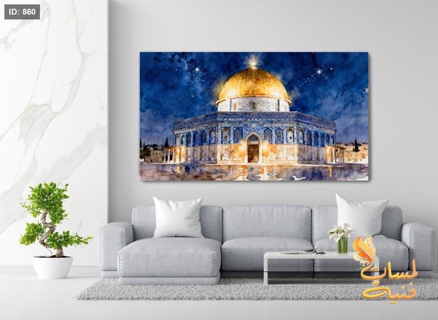 لوحة رسم مائي لقبة الصخرة بمشهد ليلي