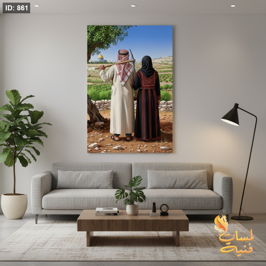 لوحة فلاح وفلاحة فلسطينين ينظرون لقبة الصخرة