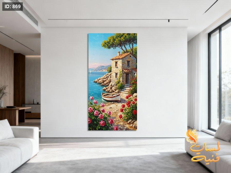 منظر طبيعي لقارب ومنزل حجر بقرب البحر