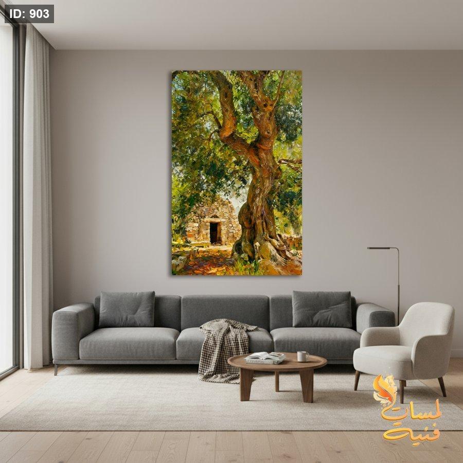 منظر طبيعي لبيت قديم وشجرة زيتون